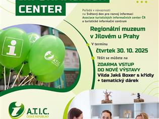 Připojujeme se k celostátní akci, která slaví práci infocenter napříč republikou! Navštivte nás a odneste si drobný dárek, úsměv i nové tipy na výlety po regionu. V rámci akce se můžete těšit na vstup ZDARMA do nové výstavy s názvem Vilda Jakš - Boxer s křídly.